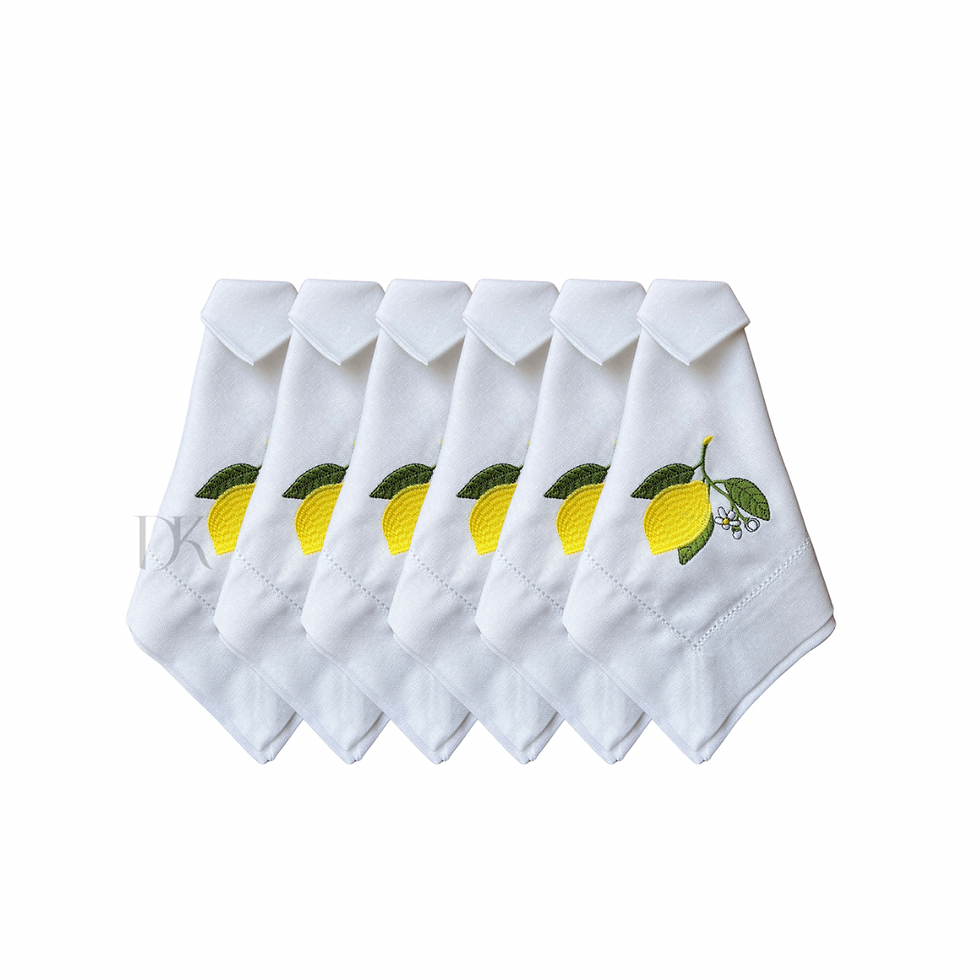 Stoffserviette aus Leinen hochwertig bestickte sizilianische-Zitrone, Weiß, 6Stk